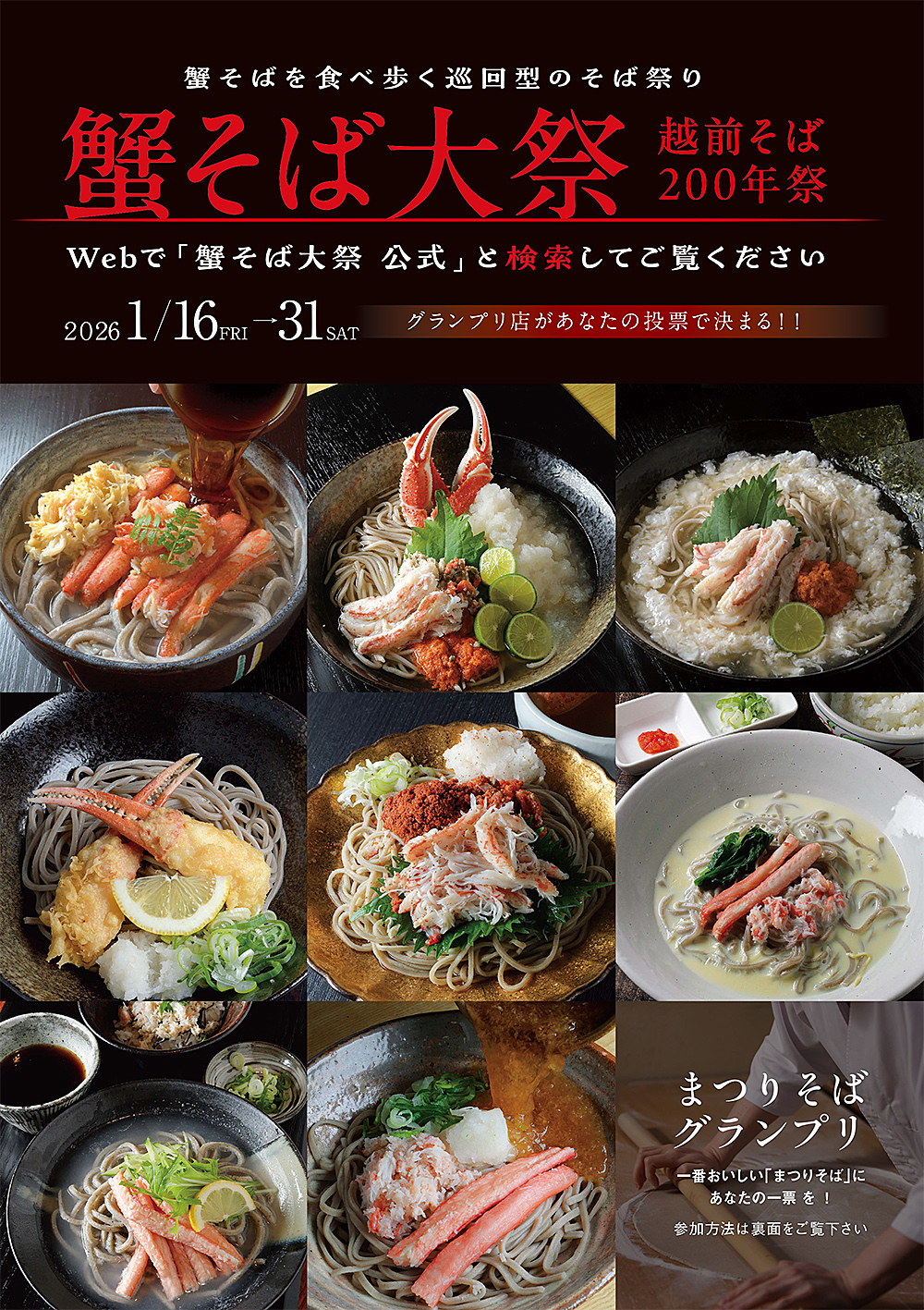 こちらは「蟹そば大祭」の公式ホームページです。2026年の「越前そば200年祭」は「蟹そば大祭」というテーマで、2026年1月16日から31日に、福井県越前市で開催します。日本一おいしいそば処・越前市で開催する、日本一のそば祭りです。